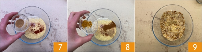 Ajoutez au mélange d'épices également le gingembre 7 et le curcuma 8. Mélangez soigneusement jusqu'à obtenir une panure homogène 9.