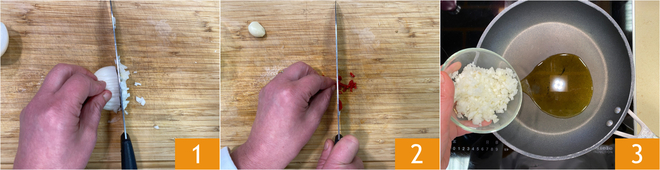 Pour préparer le chou noir poêlé, commencez par éplucher et hacher l'oignon 1, puis émincez également le piment 2. Dans une poêle, versez 20 g d'huile et ajoutez l'oignon 3.
