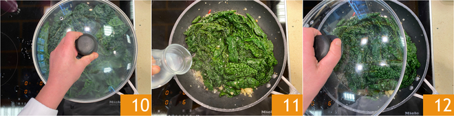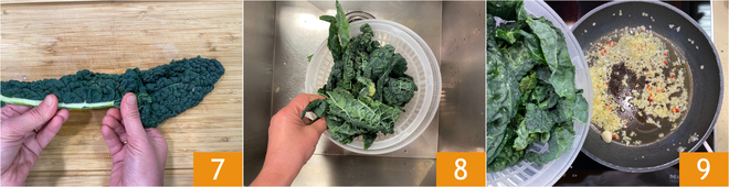 Entre-temps, occupez-vous du chou noir : retirez la tige centrale 7, lavez bien les feuilles sous l'eau en les égouttant de l'excès 8 et ajoutez-les dans la poêle 9.