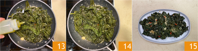 Après 20 minutes de cuisson, retirez l'ail et ajoutez le reste de l'huile, puis augmentez le feu 13 et laissez infuser encore pendant une minute 14. Votre chou noir poêlé est prêt à être servi 15 !