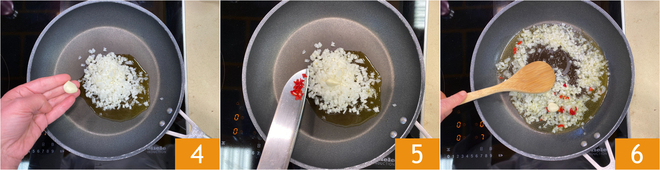 Ajoutez l'ail 4 et le piment 5 et faites cuire à feu doux pendant environ 7-8 minutes, en remuant de temps en temps 6.