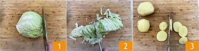 Pour préparer le chou, les pommes de terre et la saucisse, commencez par enlever les premières feuilles du chou, puis vous pouvez le couper en lanières 1 2. Pelez les pommes de terre et coupez-les en tranches épaisses d'environ 1 cm 3.