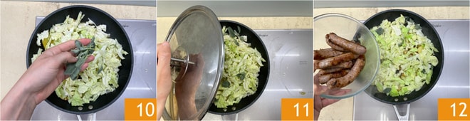 Assaisonnez avec les feuilles de sauge 10. Couvrez avec un couvercle 11, faites cuire à feu moyen pendant environ 10 minutes. Vérifiez la cuisson du chou et des pommes de terre, ajoutez la saucisse 12.