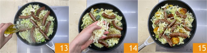 Assaisonnez avec de l'huile 13 et du poivre, ajustez le sel si nécessaire. Ajoutez le fromage provola râpé 14 et servez immédiatement le chou, les pommes de terre et la saucisse 15.