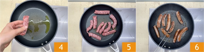 Coupez la saucisse en morceaux d'environ 10 cm, puis chauffez un filet d'huile dans une poêle et faites dorer la saucisse 4 à feu vif jusqu'à ce qu'elle soit bien dorée 5. À ce stade 6, retirez la saucisse et gardez-la au chaud.