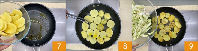 Dans la même poêle, versez les pommes de terre 7, faites-les dorer des deux côtés 8. Salez et ajoutez le chou 9.