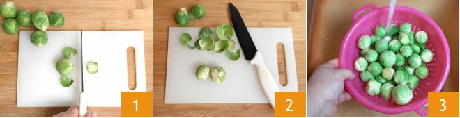 Pour réaliser les choux de Bruxelles gratinés, commencez par nettoyer les choux en éliminant le trognon avec un couteau 1 et en retirant les feuilles abîmées 2. Rincez-les sous l'eau froide 3 et séchez-les avec un torchon.