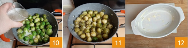 Maintenant, ajoutez la bière blonde en filet 10, délicatement, en la laissant s'évaporer et mijoter avec les choux à feu moyen-bas, jusqu'à ce que la sauce se soit un peu réduite, mais pas sèche 11. Beurrez un plat allant au four 12.