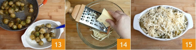 Déposez ici les choux cuits 13. Râpez le gruyère avec le côté à gros trous 14, recouvrez avec une bonne quantité de fromage 15 et enfournez dans un four ventilé déjà préchauffé à 180° pendant 8-10 minutes.