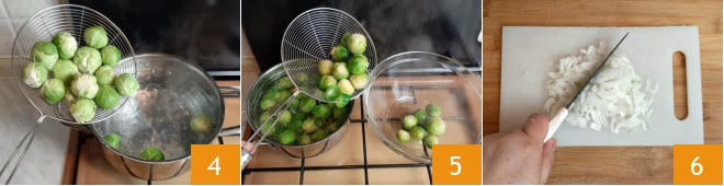 Remplissez une casserole d'eau et, une fois qu'elle bout, mettez les choux à cuire 4, sans les ramollir trop, ils doivent rester "al dente" pour continuer la cuisson à la poêle et au four. Égouttez-les 5 et mettez-les de côté. Nettoyez l'oignon et hachez-le avec un couteau 6.