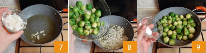 Versez l'huile dans une poêle antiadhésive, ajoutez l'oignon 7 en le faisant revenir doucement, dès qu'il est doré, ajoutez les choux 8, ajustez le sel 9 et le poivre, mélangez et laissez-les s'imprégner de saveurs pendant 2-3 minutes.