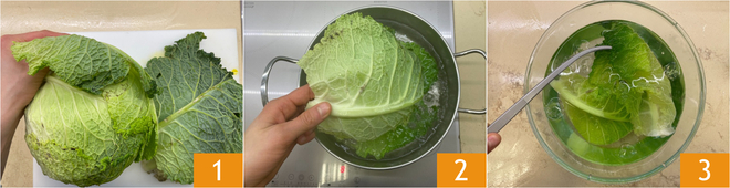 Pour préparer les roulés de chou farcis au riz et potiron, commencez par détacher les plus grandes feuilles du chou 1 et ébouillantez-les quelques minutes 2, puis plongez-les dans un bol d'eau froide avec des glaçons 3; ainsi, leur couleur restera vive. Égouttez les feuilles de chou et laissez-les sécher sur une grille.