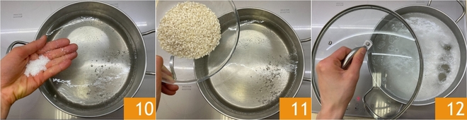Maintenant, occupez-vous de la cuisson du riz : portez à ébullition une casserole d'eau, puis salez 10 et ajoutez le riz 11. Couvrez avec le couvercle et faites cuire à feu doux pendant 15 minutes 12. Après ce temps, éteignez le feu et laissez reposer, toujours avec le couvercle : le riz doit absorber toute l'eau.