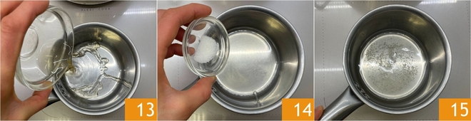Pendant ce temps, dans une petite casserole, versez le vinaigre de cidre 13, le sucre 14 et le sel. Mélangez et chauffez pour faire fondre le tout, sans porter à ébullition 15.