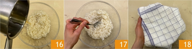 Lorsque le riz est prêt, transférez-le dans un bol et assaisonnez-le avec le mélange de vinaigre 16, mélangez bien 17 et couvrez d'un torchon humide 18. Laissez refroidir.