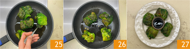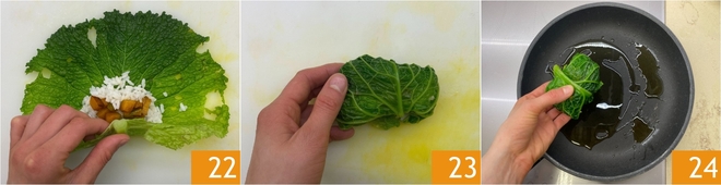 Roulez la feuille de chou sur elle-même 22 et repliez les extrémités vers l'intérieur pour sceller la farce 23. Procédez de cette manière pour former les autres roulés, puis placez-les dans une poêle avec un filet d'huile chaude 24.