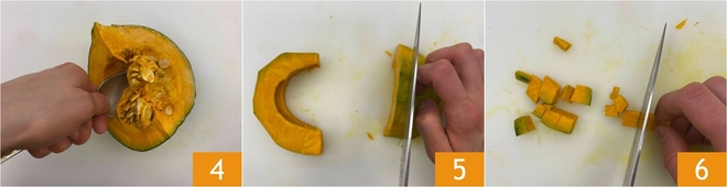 Passons au potiron : enlevez les graines et les filaments internes 4 et épluchez-le, puis coupez-le en tranches 5 et enfin en dés 6.