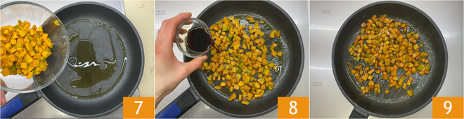 Chauffez un filet d'huile dans une poêle, ajoutez le potiron 7 et faites-le revenir quelques minutes, puis déglacez avec la sauce soja 8 et ajoutez une demi-cuillère à café de sucre. Laissez caraméliser, puis éteignez le feu et réservez 9.