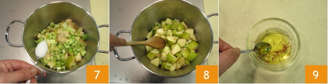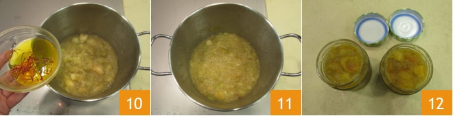 À la fin de la cuisson, versez les stigmates avec leur eau 10, mélangez et laissez sur le feu encore 2-3 minutes 11. Éteignez et une fois refroidi, votre chutney de pommes au safran est prêt 12.