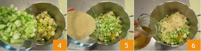 Dans une grande casserole, versez les pommes, le céleri 4, le sucre de canne 5 et le vinaigre de cidre 6.