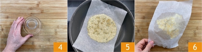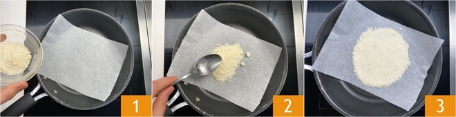 Pour préparer les tuiles au parmesan, commencez par découper 6 carrés de papier sulfurisé, d'environ 20 cm. Disposez le premier dans une poêle chaude et versez 25 g de Parmesan Reggiano DOP râpé au centre 1. Avec une cuillère, étalez le fromage 2 en formant un cercle de 15 cm 3. Faites cuire à feu moyen pendant environ 4 minutes.