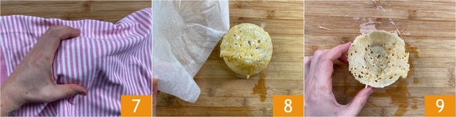 Placez un torchon dessus et pressez doucement pour donner au fromage la forme du bol 7. Retirez le papier sulfurisé 8 et laissez refroidir complètement 8. Ensuite, retournez la tuile 9 et procédez de la même manière pour réaliser les autres.