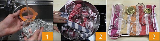 Pour préparer les cerises au sirop, vous devez d'abord vous procurer des bocaux en verre pour la conserve (du type twist-off avec capsule métallique ou avec couvercle à ressort et joint en caoutchouc) et procéder à leur stérilisation selon les lignes directrices du Ministère de la Santé rapportées en bas de la recette. Commencez par laver soigneusement les bocaux sous l'eau courante, pour les bocaux à fermeture hermétique, lavez bien aussi le joint et mettez-le de côté pour sécher 1. Tapissez une grande casserole avec un torchon propre et placez les bocaux à l'intérieur de la casserole. Passez ensuite autour des bocaux un ou plusieurs torchons pour éviter les chocs 2. Remplissez la casserole d'eau jusqu'à recouvrir les bocaux. Portez à ébullition, puis baissez le feu et laissez les bocaux dans la casserole encore 30 minutes. Dix minutes avant d'égoutter les bocaux, immergez également les couvercles pour les stériliser. Après le temps nécessaire, éteignez le feu et laissez refroidir. Lorsque l'eau sera à température ambiante, sortez les bocaux de la casserole et laissez-les égoutter sur un chiffon 3.