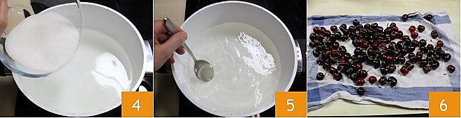 Maintenant que les bocaux sont prêts, préparez un sirop avec du sucre et de l'eau avec 200 gr de sucre et un litre d'eau en procédant comme suit : mettez une casserole avec l'eau sur le feu et ajoutez le sucre dedans 4. Portez à ébullition, et mélangez jusqu'à ce que le sucre soit complètement dissous 5. Il est important de ne pas trop cuire le sirop sinon il risque de se transformer en caramel. Laissez refroidir le sirop, pendant ce temps prenez les cerises, choisissez-les fermes et mûres, lavez-les bien et séchez-les 6.