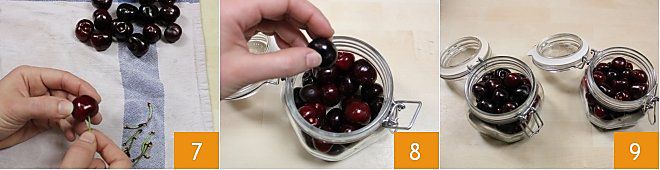 Éliminez la queue 7. Placez les cerises dans les bocaux à fermeture hermétique 8 en essayant de les disposer de manière à laisser le moins d'espaces vides possible, sans cependant les écraser trop. Avec les doses indiquées, vous obtiendrez deux bocaux d'une capacité de 500 ml 9.