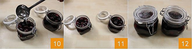 Versez le sirop précédemment préparé sur les cerises dans les bocaux 10, en les agitant de temps en temps pour faire sortir d'éventuelles bulles d'air ; arrêtez-vous avec le sirop à 1 cm du bord 11. Enfin, fermez les bocaux 12. Si vous utilisez des pots avec un couvercle à vis, vissez bien les couvercles mais sans serrer excessivement. À ce stade, procédez à l'ébullition : placez les bocaux dans une grande casserole, pour éviter que les pots ne se cassent en se heurtant pendant qu'ils bouillent, vous pouvez les envelopper séparément dans des torchons. Remplissez la casserole d'eau : le niveau de l'eau ne doit pas dépasser le couvercle des pots. Portez à ébullition et faites bouillir pendant 20-30 minutes. Passé ce temps, éteignez le feu, retirez-les de l'eau à l'aide d'une pince et laissez refroidir. Si vous utilisez des pots avec des couvercles à vis, une fois que les pots auront refroidi, vérifiez si le vide d'air s'est correctement formé : vous pouvez appuyer au centre du couvercle et, si vous n'entendez pas le classique "clic-clac", le vide d'air est formé. Si vous utilisez des pots avec des fermetures à joint en caoutchouc, au moment de consommer les cerises, vous pouvez faire le test du vide en tirant sur la languette prévue à cet effet : si en la tirant elle produit un bruit sec, cela signifie que le contenu a été correctement conservé sous vide. En revanche, si en tirant sur la languette le joint semble "mou", cela signifie que le vide d'air ne s'est pas correctement formé et il est préférable de ne pas consommer le contenu. Vos cerises sont prêtes à être dégustées !