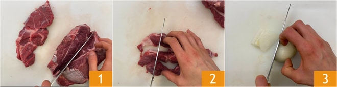 Pour préparer le sanglier en daube, commencez par couper la viande, d'abord en tranches 1 puis en morceaux 2. Coupez également l'oignon en tranches, après l'avoir épluché 3.