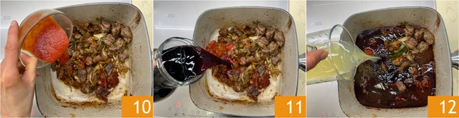 Versez la purée de tomates 10, mélangez et faites cuire 2 minutes. Ajoutez le vin 11 et faites évaporer toute la partie alcoolisée. Enfin, ajoutez le bouillon de viande 12 et portez à ébullition.