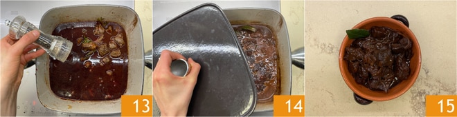 Ajustez le sel et le poivre 13. Mélangez, couvrez avec un couvercle 14, baissez le feu au minimum et laissez cuire environ 3 heures, en remuant de temps en temps, jusqu'à ce que la viande soit tendre. Si nécessaire, pour prolonger la cuisson, vous pouvez ajouter de l'eau ou un autre bouillon. Dressez sur l'assiette et décorez avec une feuille de laurier. Votre sanglier en daube est prêt à être dégusté chaud 15 !
