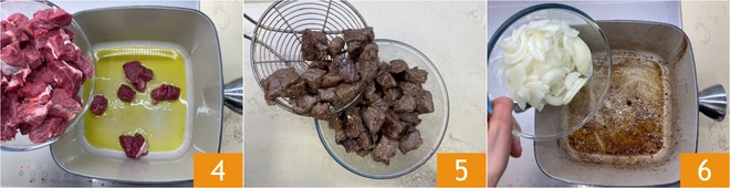 Dans une casserole, versez l'huile, ajoutez la viande 4 et faites-la dorer à feu moyen-vif. Retirez la viande 5 et mettez-la de côté. Dans la même casserole, ajoutez l'oignon 6.