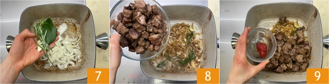 Ajoutez également les gousses d'ail en chemise écrasées, le laurier et le romarin 7. Faites revenir jusqu'à ce que les oignons soient translucides, si nécessaire ajoutez encore un peu d'huile. Ajoutez la viande 8, mélangez et faites cuire quelques minutes. Ajoutez le concentré de tomate 9.