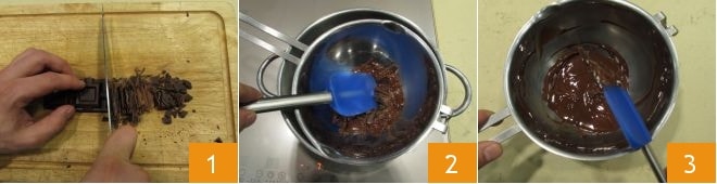 Pour réaliser les chocolats noirs avec crème de mascarpone, commencez par hacher le chocolat noir avec un couteau 1, faites fondre le chocolat au bain-marie 2 jusqu'à ce qu'il soit complètement fondu 3.