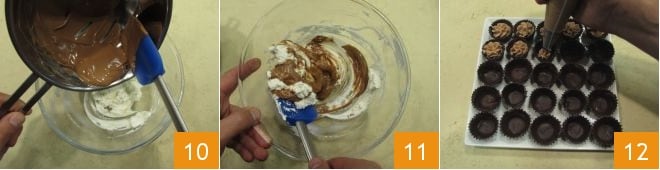 Versez le chocolat au lait fondu dans le bol avec le mascarpone 10, mélangez encore jusqu'à obtenir une crème homogène 11. Transférez la crème dans une poche à douille avec une douille étoilée et mettez-la à raffermir au réfrigérateur pendant environ 1 heure. Après ce temps, récupérez à la fois les coques de chocolat et la crème, pressez une noix de crème sur chaque chocolat 12. Une fois tous les chocolats garnis, décorez-en la moitié avec des morceaux de noisettes et l'autre moitié avec des morceaux de pistaches.