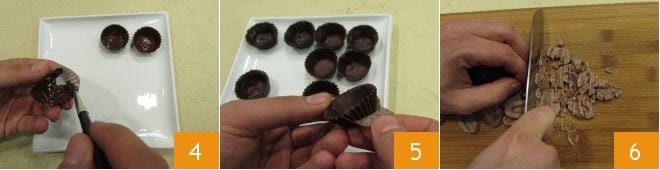 À ce stade, badigeonnez l'intérieur y compris les bords des petits moules en papier 4. Placez-les sur un plateau et laissez-les durcir pendant 1 heure au réfrigérateur. Après ce temps, récupérez les moules, assurez-vous que le chocolat est bien solide, puis retirez-les délicatement des moules 5. Entre-temps, préparez la crème : hachez également le chocolat au lait 6,