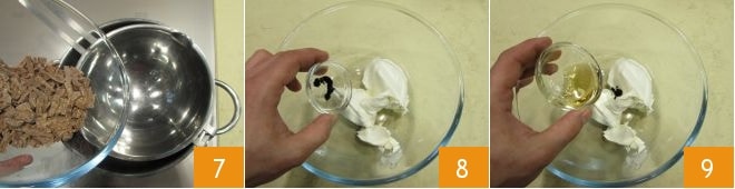 placez-le dans un bain-marie 7 jusqu'à ce qu'il soit complètement fondu. À part, dans un bol, mettez le mascarpone, aromatisez-le avec les grains extraits de la gousse de vanille 8 et avec le rhum 9 mélangez avec une spatule pour amalgamer.