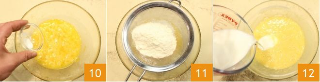 ajoutez une pincée de sel 10, la farine tamisée et les graines de la gousse de vanille 11, versez le lait à température ambiante en filet 12 tout en continuant de mélanger avec le fouet,