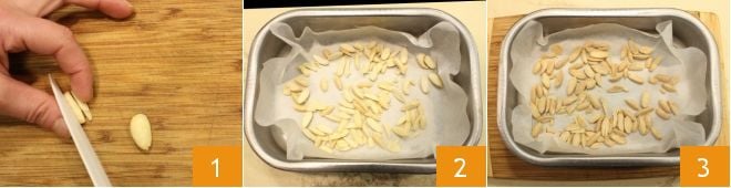 Pour réaliser le clafoutis aux prunes, commencez par couper les amandes émondées en éclats 1, placez-les sur une plaque recouverte de papier sulfurisé 2 et mettez-les à griller dans un four préchauffé à 180°C pendant environ 5 minutes (ou dans un four ventilé pendant quelques minutes) ou jusqu'à ce qu'elles soient légèrement dorées 3.