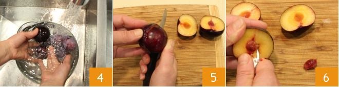 Occupez-vous maintenant des prunes : lavez-les sous l'eau courante 4, coupez-les en deux 5, retirez le noyau avec un couteau d'office 6