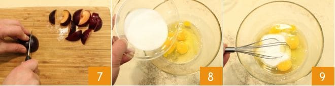 puis coupez-les en tranches assez régulières 7. Mettez les fruits de côté et préparez la pâte : dans un bol, mettez les œufs entiers, ajoutez le sucre 8, mélangez avec un fouet à main 9,