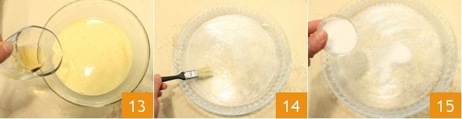 pour finir, aromatisez avec le brandy 13. Maintenant que la pâte est prête, beurrez un moule de 28 cm de diamètre 14 et saupoudrez-le de sucre en poudre 15.