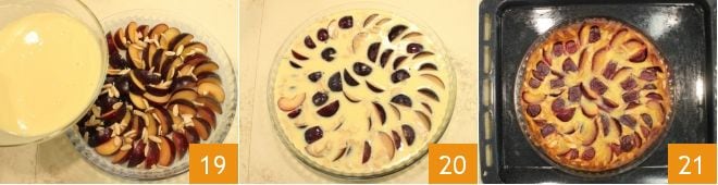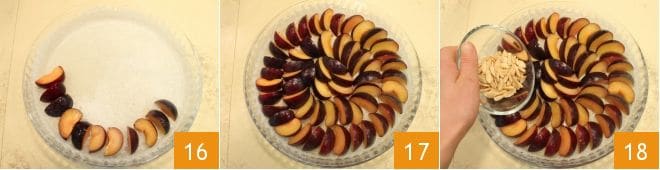 Disposez au fond du moule les tranches de prunes en formant un motif de cercles concentriques (16-17), puis saupoudrez les prunes avec les amandes grillées 18.