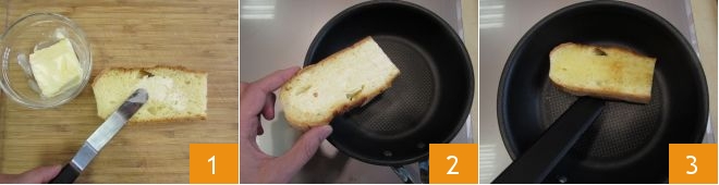 Pour préparer le madame club sandwich, commencez par tartiner le beurre sur 6 tranches de pain d'environ 1,5 cm d'épaisseur 1. Transférez-les dans une poêle antiadhésive bien chaude et faites-les griller pendant quelques minutes 2, en les retournant à mi-cuisson 3.