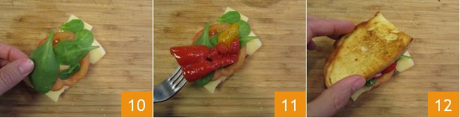 les jeunes pousses d'épinard 10 et les poivrons rôtis à l'huile 11. Refermez avec la deuxième tranche de pain 12