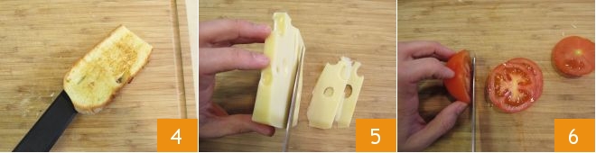 Mettez de côté 4 et passez au reste des préparations. Tranchez finement le fromage 5, puis la tomate 6.
