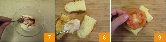 Versez la mayonnaise dans un bol et enrichissez-la de paprika fumé 7, puis mélangez bien et étalez-la sur les tranches de pain grillées 8. Composez la première couche en déposant quelques tranches de fromage et de tomate 9,