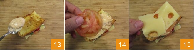 et composez le deuxième étage avec de la mayonnaise 13, les tomates 14, le fromage 15,